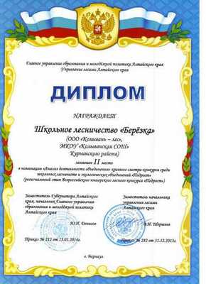 По итогам 2013 года, школьное лесничество "Берёзка", заняло 2 место среди школьных лесничеств Алтайского края!