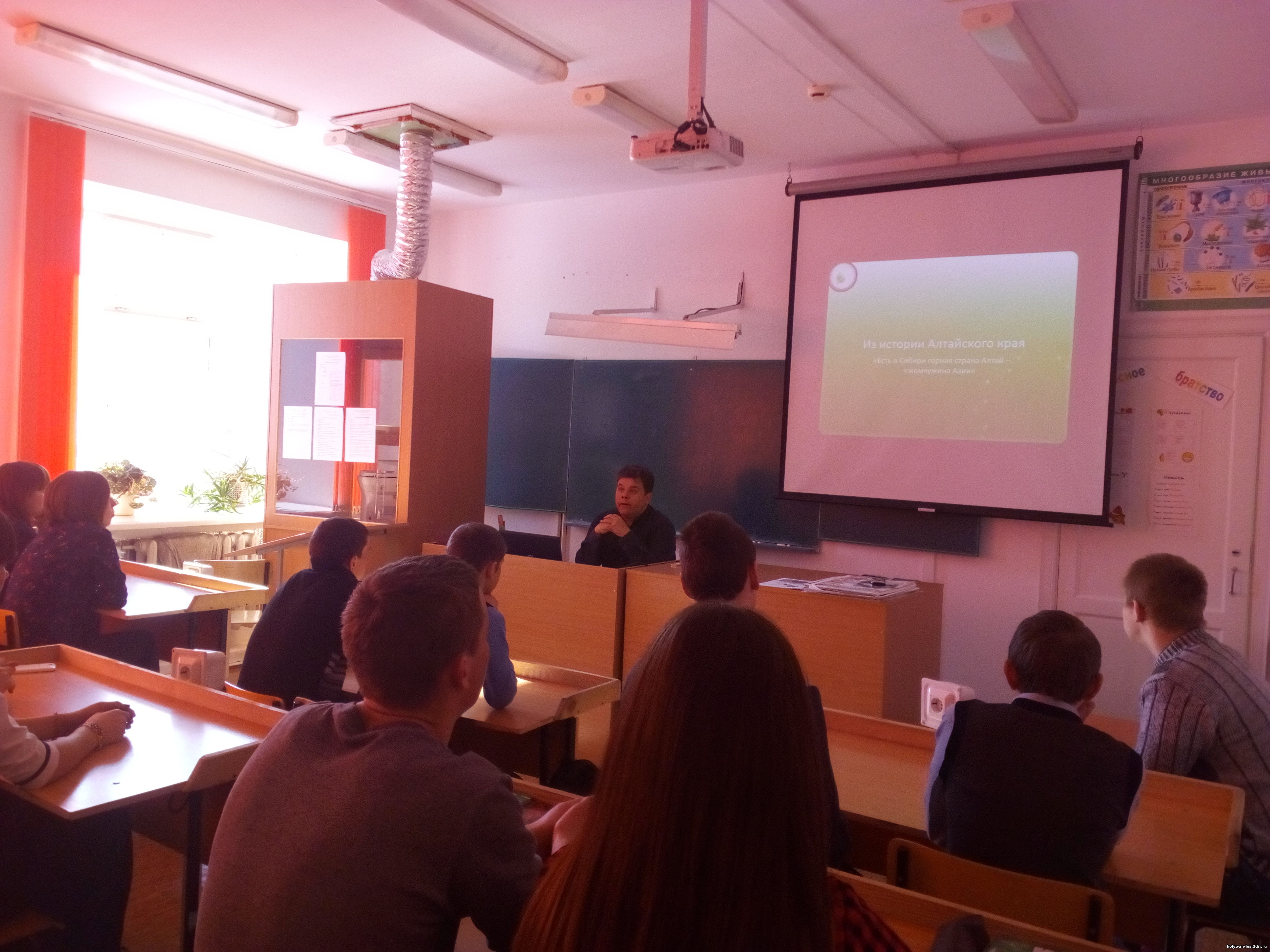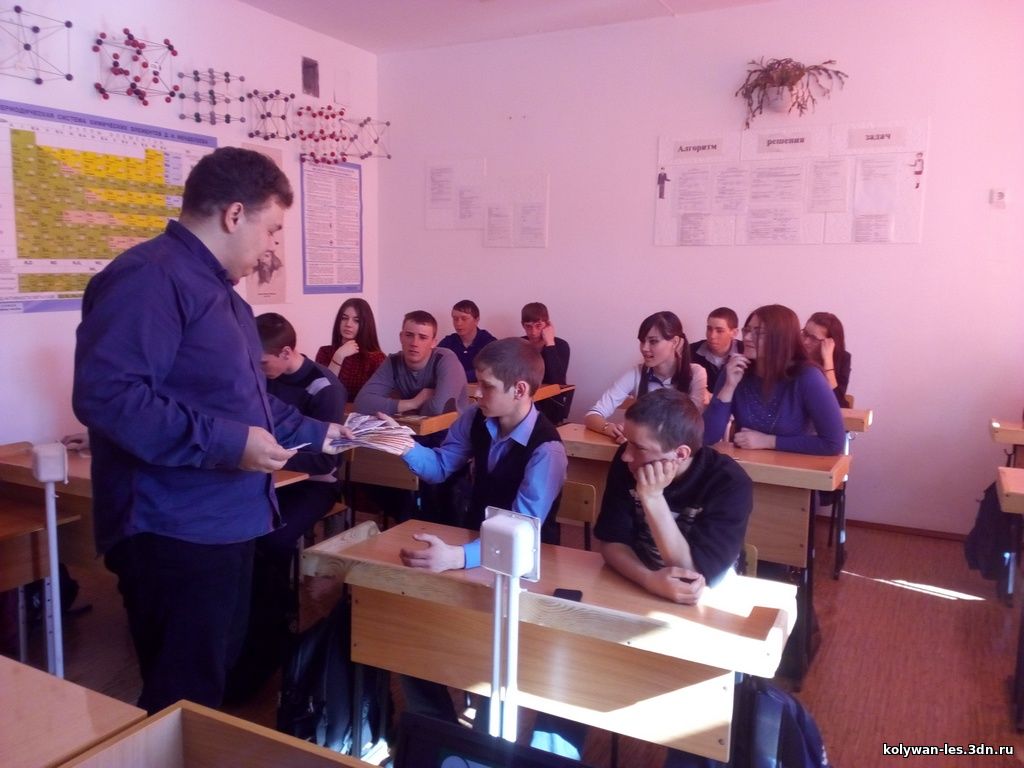 В марте 2017 года, в МКОУ "Колыванская сош" проходила встреча с Карташовым Александром Владимировичем, специалистом отдела экопросвещения ФГБУ «Государственный природный заповедник «Тигирекский». Александр Владимирович неоднократно приезжает в школу с интереснейшими беседами для учащихся о природе Тигирекского заповедника. Двадцать первого марта Александр Владимирович провел беседу для учащихся 9 класса. Беседа произвела большое впечатление на ребят, впервые они узнали о том, насколько богат был животный мир с.Колывань более 200 лет назад, какие ученые исследователи посещали наше село.